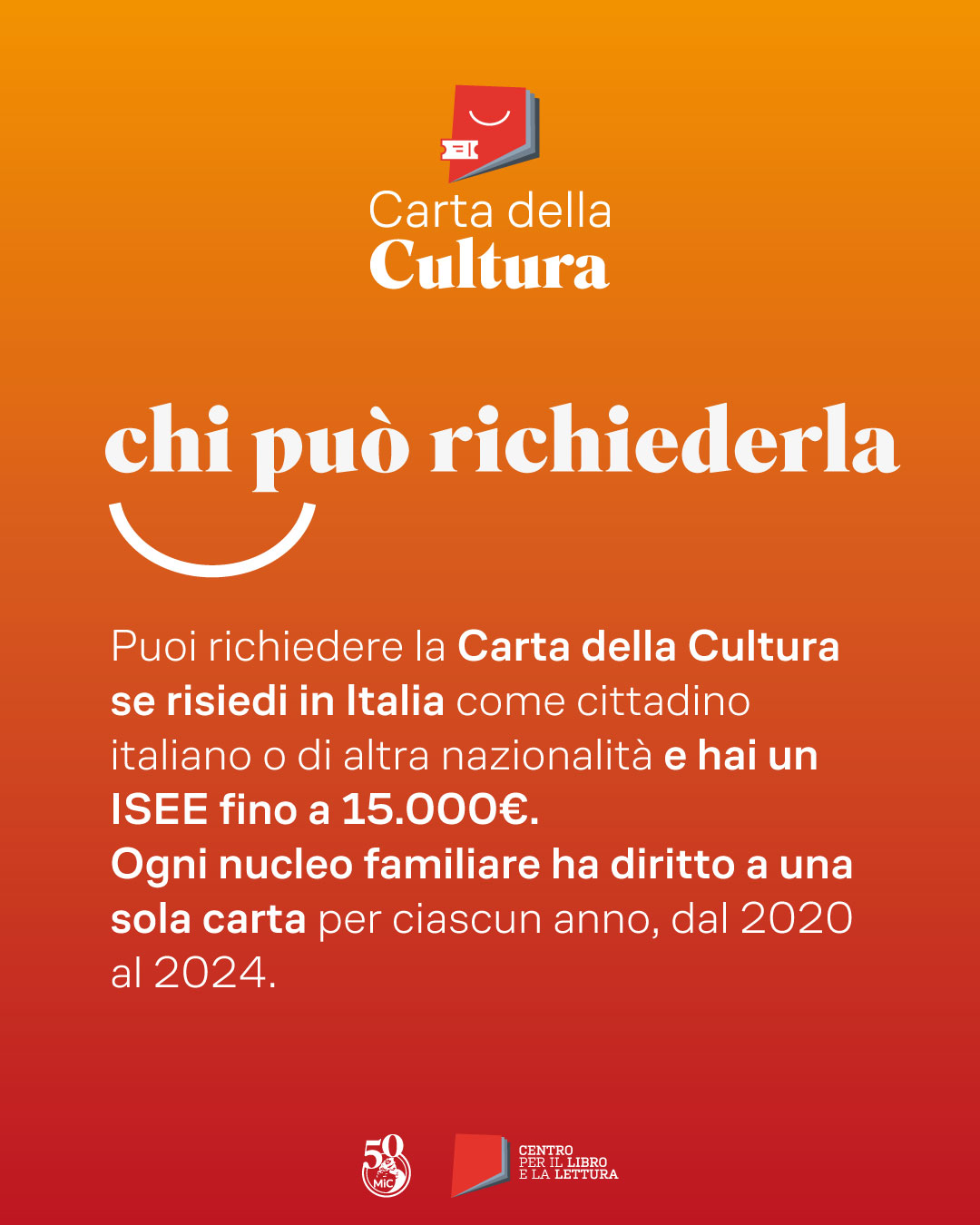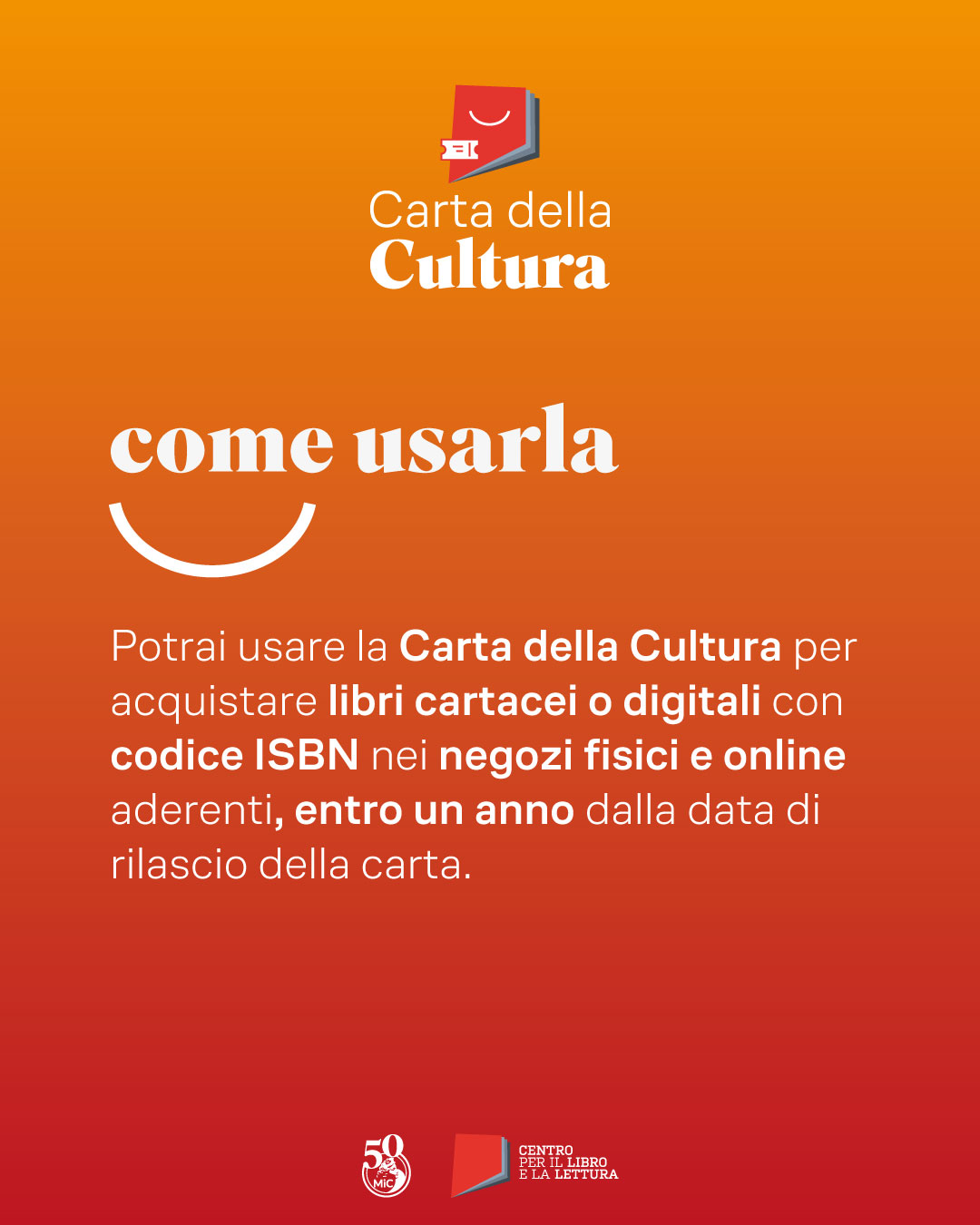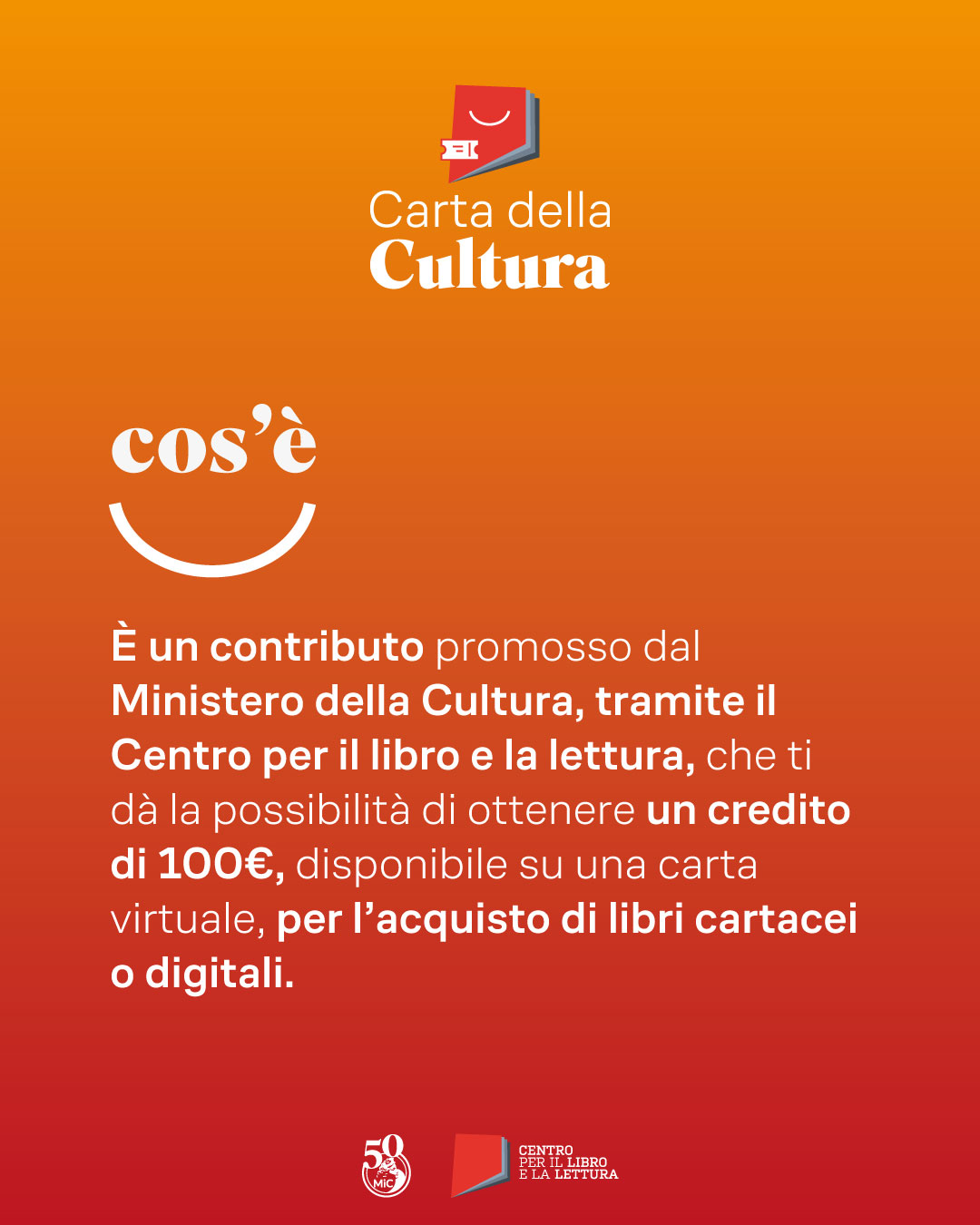 Carta della cultura, in formato digitale e con un valore di 100 euro, è un contributo che mira, attraverso l’acquisto dei libri, a contrastare la povertà educativa e culturale. L’importo potrà essere speso per l’acquisto di libri, sia cartacei che digitali (purché dotati di codice ISBN), presso le librerie e i punti vendita convenzionati.