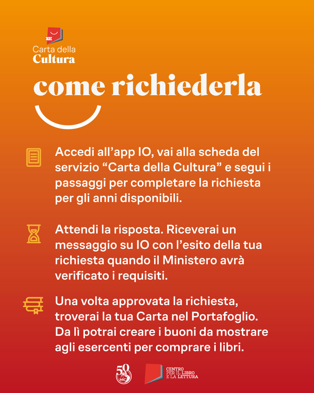 C’è tempo fino alle ore 12:00 del 31 ottobre 2025 per richiedere la “Carta della Cultura”, l’iniziativa del Ministero della Cultura realizzata tramite il Centro per il libro e la lettura e con la gestione tecnica affidata a PagoPA, CONSAP E SOGEI.