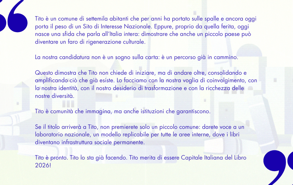 La visione alla base della candidatura della città di Tito a Capitale Italiana del Libro 2026 pone la lettura al centro di un progetto di rigenerazione territoriale, sociale e culturale. In un’area che porta ancora i segni di un passato industriale e ambientale complesso, Tito sceglie di investire sulla lettura non come fine, ma come strumento per costruire una comunità educante, inclusiva e consapevole.