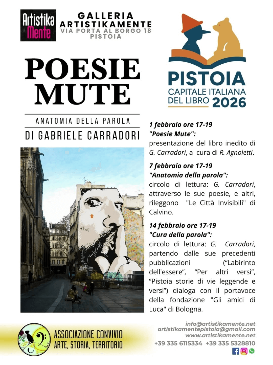 Artistikamente Via Porta al Borgo, 18, Pistoia, PT, ItalyPistoia 2026Inaugurazione della mostra di Gabriele Carradori Poesie mute - Anatomia della parola a cura di Roberto Agnoletti, fotografie di David Dolci. Accesso libero e gratuito. Visitabile fino al 14 febbraio dal martedì al sabato 10.00-12.00 e 15.00-19.00.
