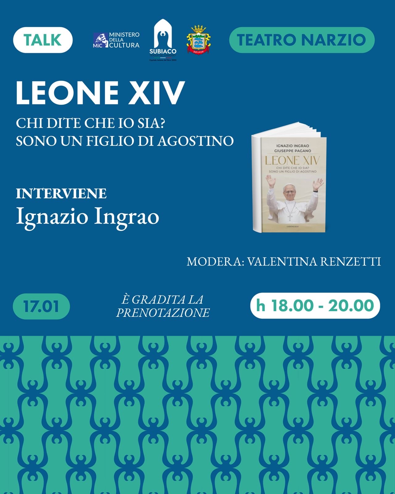 Presentazione del libro Leone XIV - Chi dite che io sia? Sono un figlio di Agostino di Ignazio Ingrao e Giuseppe Pagano. Interviene l'autore Ignazio Ingrao. Sabato 17 gennaio, dalle 18:00 presso il Teatro Cinema Narzio di Subiaco. E' gradita la prenotazione. |